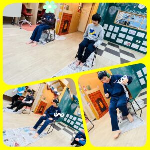 椅子に座り、長くつなげた新聞紙を足でくるくると巻き取っていきます。見た目は地味ですが、やってみると「きつい〜!」と声が出るほど💦 しっかり脚力を使い、最後まで頑張る姿が見られました。