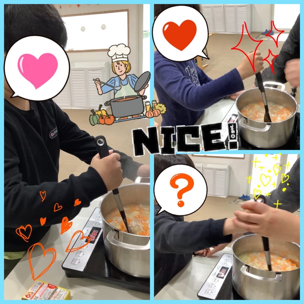 材料を炒めて水を入れ、最後はみんなでカレールーを入れて