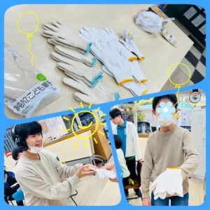 片方の軍手をくるんと丸めてお団子状態にし、もう片方の軍手の上に置きます。