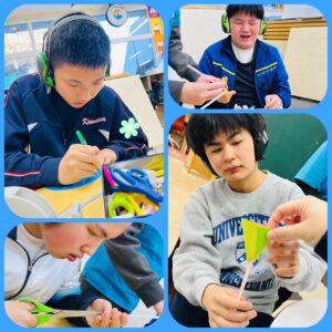まずはストローの先を花びらのようにチョキチョキと切って広げ、カラフルな折り紙をくるっと巻き付けてました。