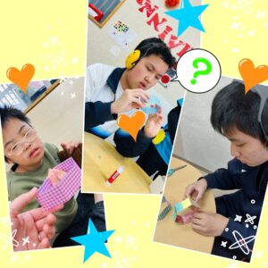 柄の違う折り紙を重ねてひっくり返すと、一瞬で模様が変わったように見える不思議な仕掛けに、「え!変わった!?」「もう一回やって!」と大盛り上がりでした✨