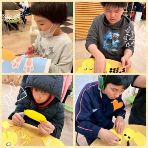 その後は、うさぎやひよこが卵に入ったイースターの飾りを、画用紙やシールで作って貼り付けました♪