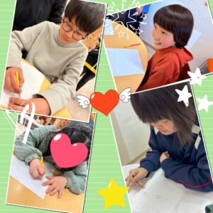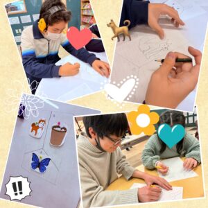 お手本の配置と同じになるよう、マスの中のイラストを覚え、同じマスに描く✨