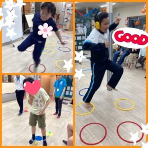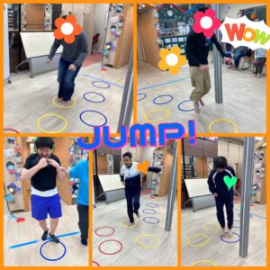 次はフープの中をひとつずつジャンプで進んでいき、静かに着地できるかどうかに挑戦!