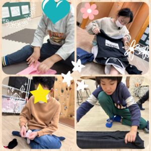 最初は簡単なものから始めて、だんだん長袖や上着など難しいものにもチャレンジしていきます。