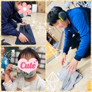 みんなでタオルや靴下を上手に畳むところからスタート。