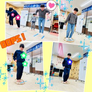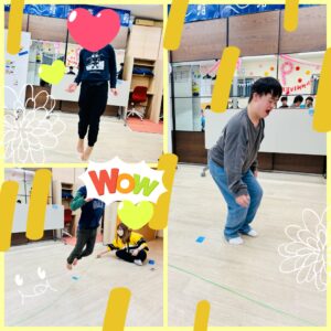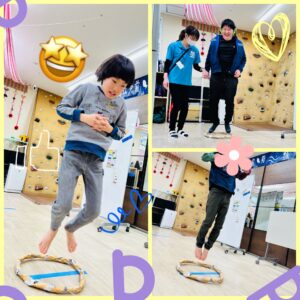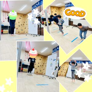 動くフープの輪から出ないようにしつつ、目印のラインのところでジャンプします。