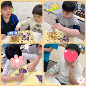 「どんな形になるかな?」と楽しみながら、力加減を工夫して押していました。房の形が出来上がると、ペンでフサを描き加え、素敵なブドウが完成しました。