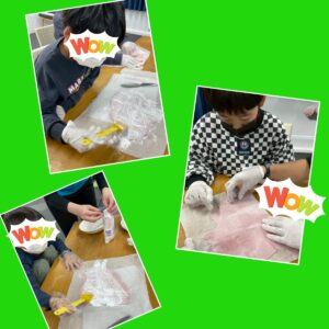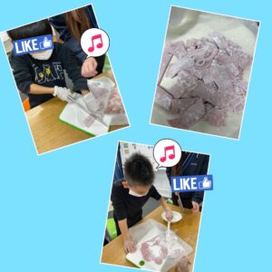 クッキングシートの上に広げてクッキングシートで挟み、綿棒でうすく伸ばします!