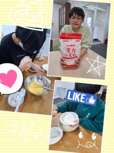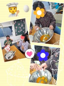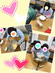 粉をふるいにかけたり、卵を狙った場所に割り入れたりと慎重な工程が多く、みんないつも以上に真剣な表情で取り組んでいました!