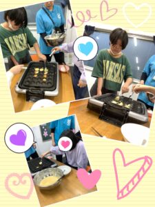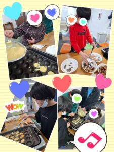 材料を混ぜたらタコ焼き機で丸く焼いていきます♪