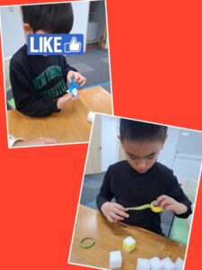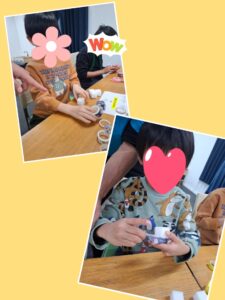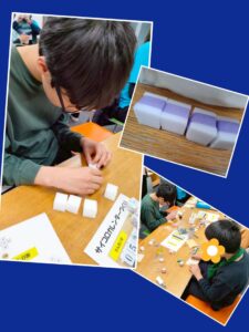 DIYする時には木製の材料を使用することが多いようですが、今日は力加減や手先の動きを意識してもらうために、メラミンスポンジを土台にして作ってもらいました!