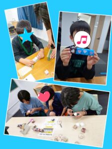 マスキングテープを巻き付ける力が強くてスポンジがぺちゃんこになってしまう子、シールやテープのデザインの組み合わせをじっくり考える子など、様々な姿が見られました(*^^*)