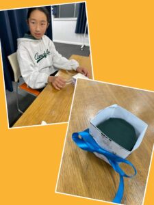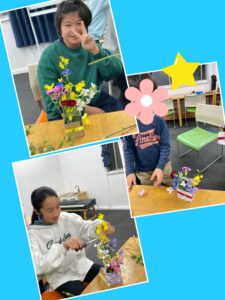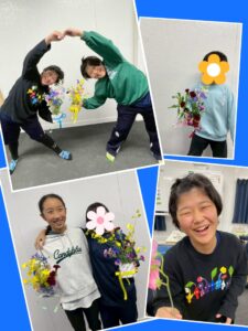 フラワーアレンジメントが完成すると嬉しそうに見せてくれました!
