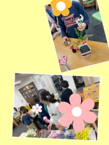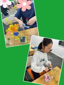 いろんな花を自分たちで選んで感性に従って綺麗にまとめて作っていきます!