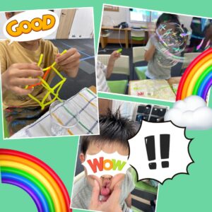 今日は、みんなで針金を使って、色々な形のシャボン玉のわく作りに挑戦しました!🧪