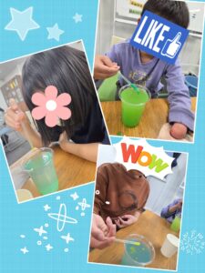 水の入ったコップにストローをそっと差し込むと、水の中にふわっと泡が生まれました。子どもたちは「出てきた」「まるいね」と目を輝かせながら、ゆっくり動く泡の形や大きさの変化をじっくり観察していました。