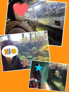 大きな水槽の魚たちを見て「おおきい!」「きれい!」と目を輝かせて観察していました。