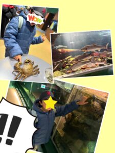 タッチパネルの展示では、魚の名前や特徴を自分で選んで調べる姿も見られ、興味をもって楽しんでいました。
