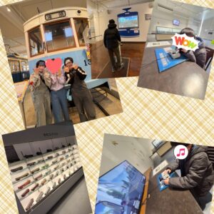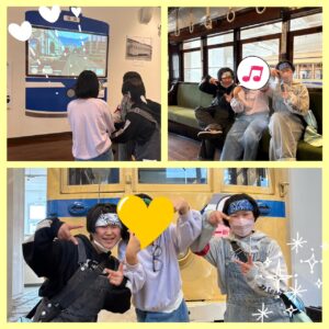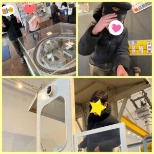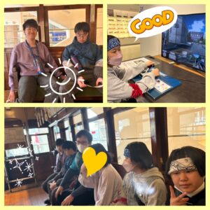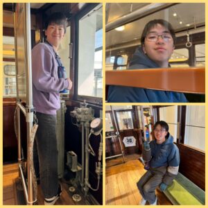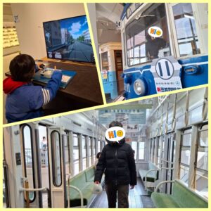 今日は市電保存館へ出かけ、昔の市電や展示物を見学しました。実際に車両の中に入ると「こんな椅子なんだ」「窓が大きいね」と興味津々。運転席ではレバーやメーターをじっくり観察し、運転士さん気分を味わっていました。歴史ある市電に触れ、貴重な体験ができました。