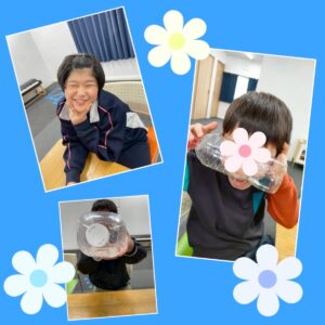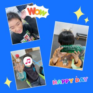 1人1本ペットボトルを配りその中に水と好きな色の絵具、ラメなどを入れます!