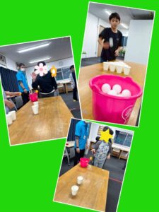 チームで順番を決めて1人ずつ投げて、全ての紙コップにピンポン玉を入れられたら、勝ちとなります!