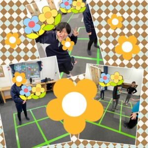 この遊びでは、リズムよくジャンプ移動するだけでなく、鬼がどの方向へ移動しようとしているのか観察したり、お友達と一緒のマスに入る時のスピード調整などを同時に考える必要があり、実はとても頭を使う内容になっています!
