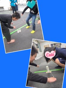 「紙コップタワー」とは、輪ゴムの4か所に結ばれた紐を2人で2本ずつ引っ張って紙コップを掴み、運びます。そして、運んだ紙コップを重ねてタワーをつくる!というゲームです♪