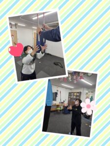 子どもと対面に、スタッフ2人が棒を2本ずつ持って準備!棒から手を離したら、床に落ちる前に瞬時にキャッチできるかチャレンジです!!!