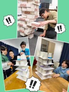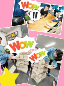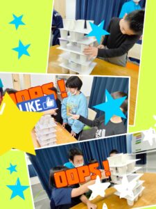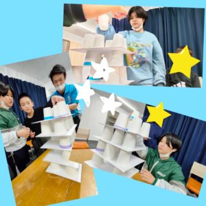 今日は紙コップを使った「紙コップジェンガ」に取り組みました。