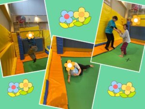 今日は室内で「ポコトランプ(トランポリン)」を使って体を動かしました!