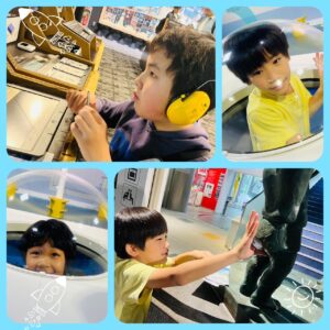 巨大なロケットエンジンや深海6500などの大型模型や、飛行機の客席なども実際に触れることができ楽しそうな子どもたち!