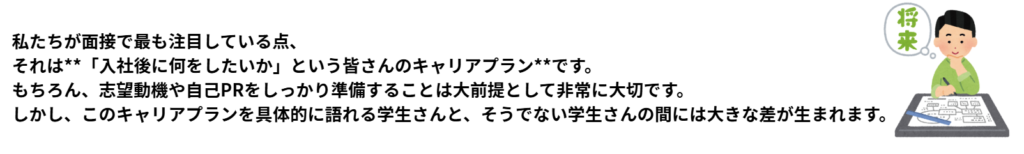 弊社の面接では特に大切にしている点ですので、ぜひご自身のキャリアプランを深く掘り下げ、考えてみてください。